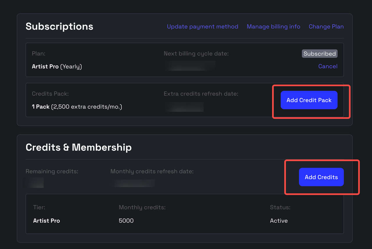 You can get more monthly AI Credits by upgrading your Artist subscription to Artist Pro, or by adding extra AI Credit Packs to your account.