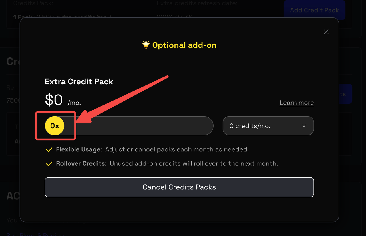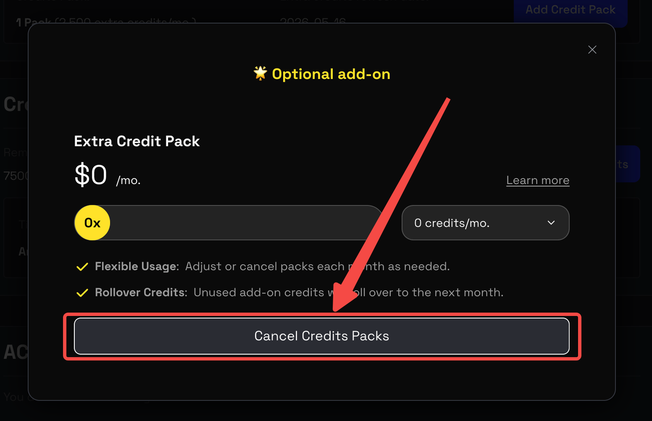 - Click the gray “Cancel Credits Packs” button to complete the cancellation.